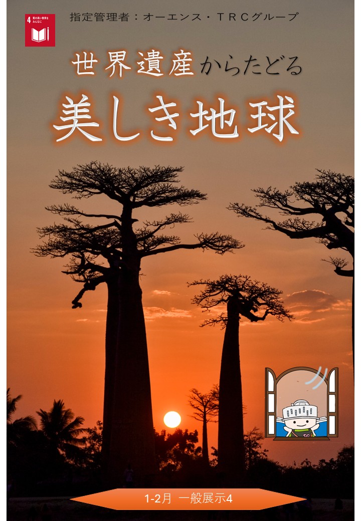 2025/12/27 【1-2月一般展示4 ~世界遺産からたどる 美しき地球~ ~世界遺産へようこそ~ この美しき壮大な自然遺産・文化遺産には、 地球の歴史が刻まれています。 是非この機会に、日本、世界中の世界遺産を そして、私たちの美しき地球の全てをご覧ください。