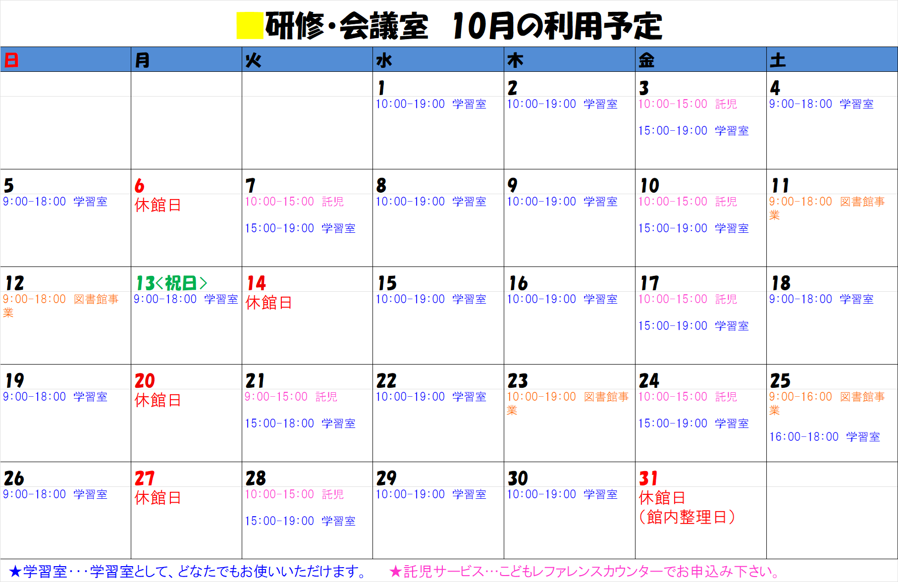 10月の研修会議室のスケジュールは画像の通りです。