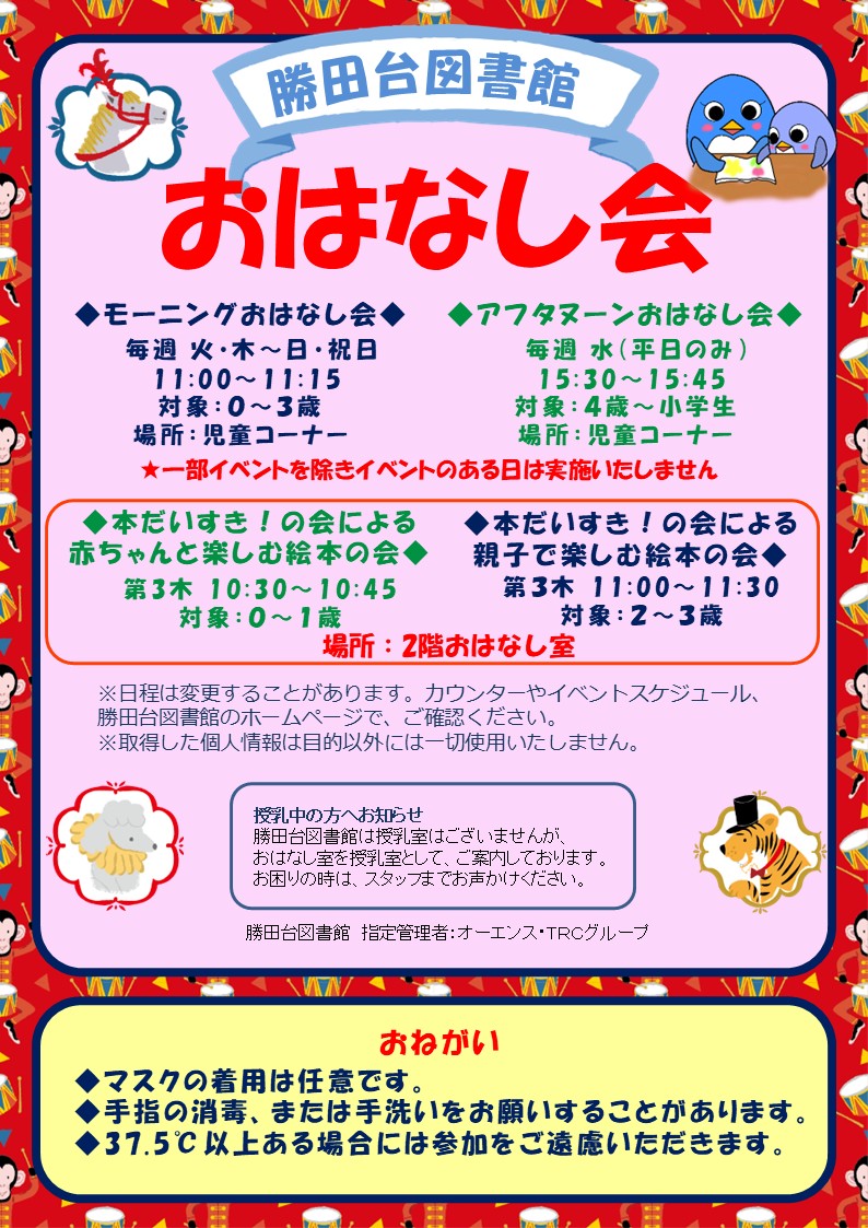 「モーニングおはなし会」「アフタヌーンおはなし会」の開催日時が以下のとおり一部変更となります。