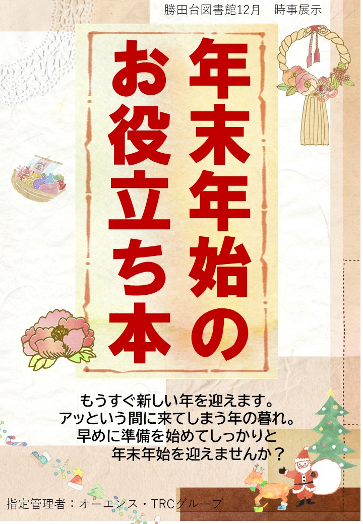 2025/11/29 【時事展示】『年末年始のお役立ち本』 もうすぐ新しい年を迎えます。 アッという間に来てしまう年の暮れ。 早めに準備を始めてしっかりと 年末年始を迎えませんか? クリスマスやラッピング、 おせち料理や年賀状など、 年末年始に役立ちそうな本を集めました。