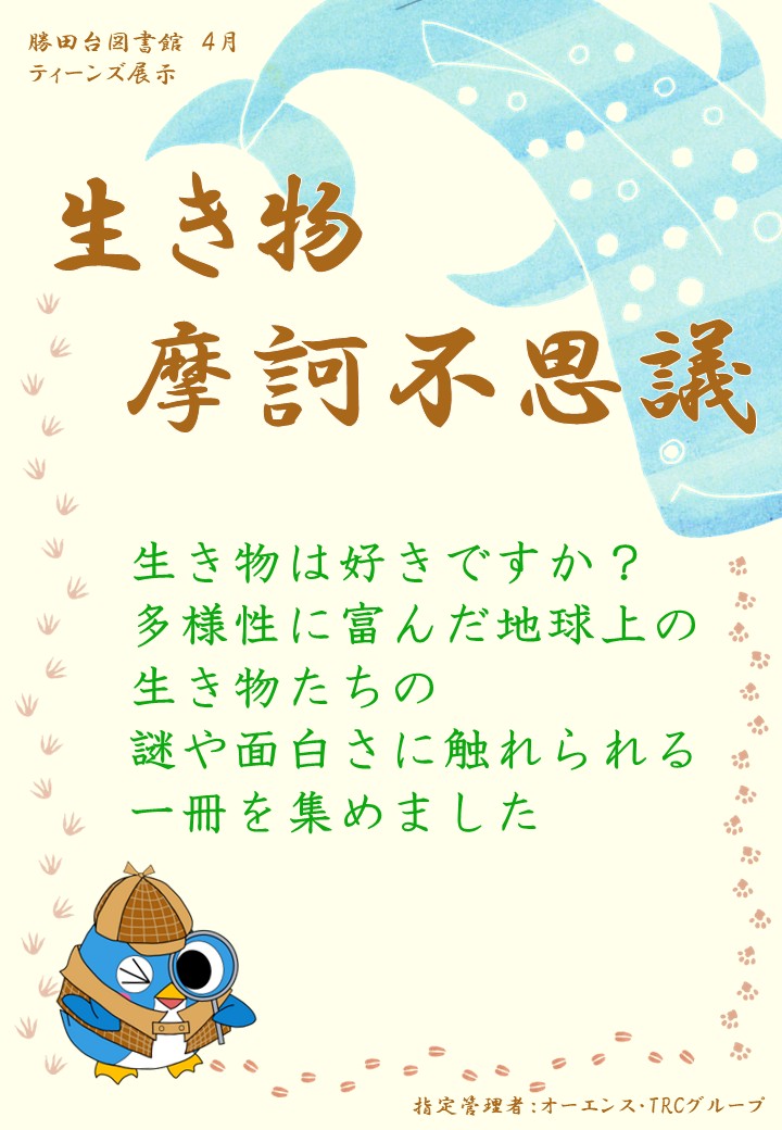 2026/04/01 【4月】ティーンズ展示『生き物摩訶不思議』 生き物は好きですか? 多様性に富んだ地球上の生き物たちの 謎や面白さに触れられる一冊を集めて展示しています。 ぜひぜひお手にとって、ページをめくってみてください!