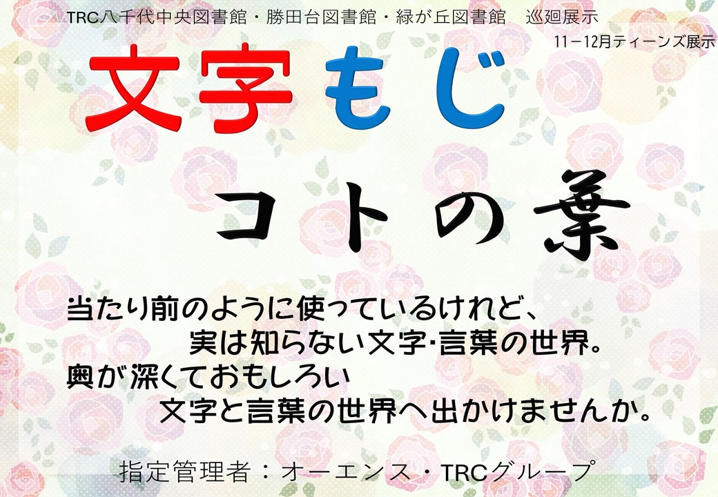 2025/11/01 【11~12月】ティーンズ展示『文字もじコトの葉』 勝田台・中央・緑が丘の3館を回る「巡回展示」。 今回のテーマは「文字もじコトの葉」です。 普段何気なく使っている言葉、ふと気になることがありませんか? 「あれ、この言葉ってどういう由来があるんだろう?どんなふうに出来たんだろう?」 知れば知るほど奥深い、文字や言葉の世界。 言の葉の沼へハマりましょう。
