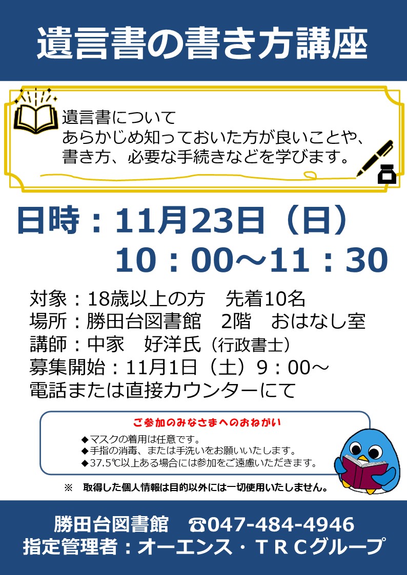 2025/10/28 満員になりました【11月23日(日)開催】遺言書の書き方講座 ※好評につき、満員に達しました。次回の開催をお楽しみに! 遺言書の書き方について あらかじめ知っておいた方が良いことや、書き方、必要な手続きなどを学びます。 【対象】18歳以上 先着10名 【場所】勝田台図書館2階おはなし室 【講師】中家 好洋氏(行政書士) 【募集開始】11月1日(土)9:00~ 電話または直接カウンターにて