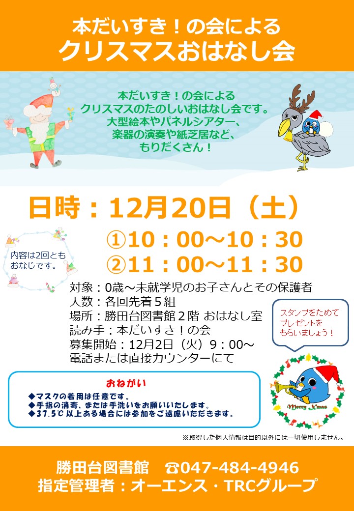 2025/11/20 【12月20日(土)かいさい】イベント『本だいすき!の会によるクリスマスおはなし会』 おはなしかいでおなじみの、「ほんだいすき!のかい」による えほんのよみきかせ、パネルシアター、かみしばいなどの スペシャルなたのしいクリスマスのおはなしかいです。 ぜひいらしてください。 【にちじ】 12がつ20にち(どようび)ごぜん ➀10じ~10じ30ふん ➁11じ~11じ30ふん(ないようは2かいともおなじです。) 【ばしょ】 かつただいとしょかん 2かい おはなししつ 【たいしょう】0さい~みしゅうがくじのおこさんとそのほごしゃ 【ていいん】 かくかいせんちゃく5くみ 【もうしこみ】12がつ2にち(かようび)ごぜん9じ~。でんわかカウンターでおもうしこみください。