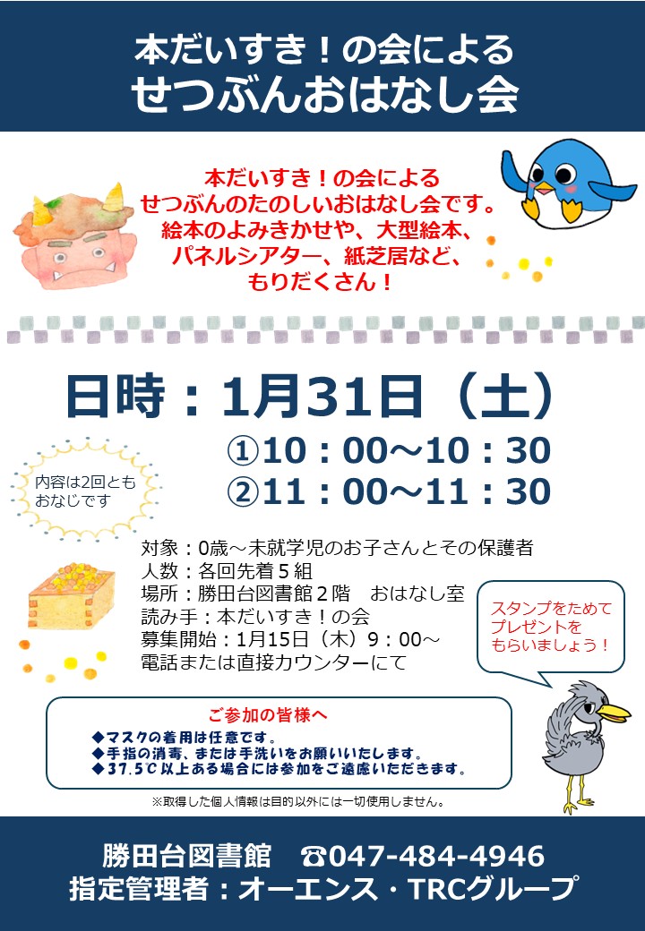 「本だいすき!の会による親子で楽しむ絵本の会」は変更はございません。
