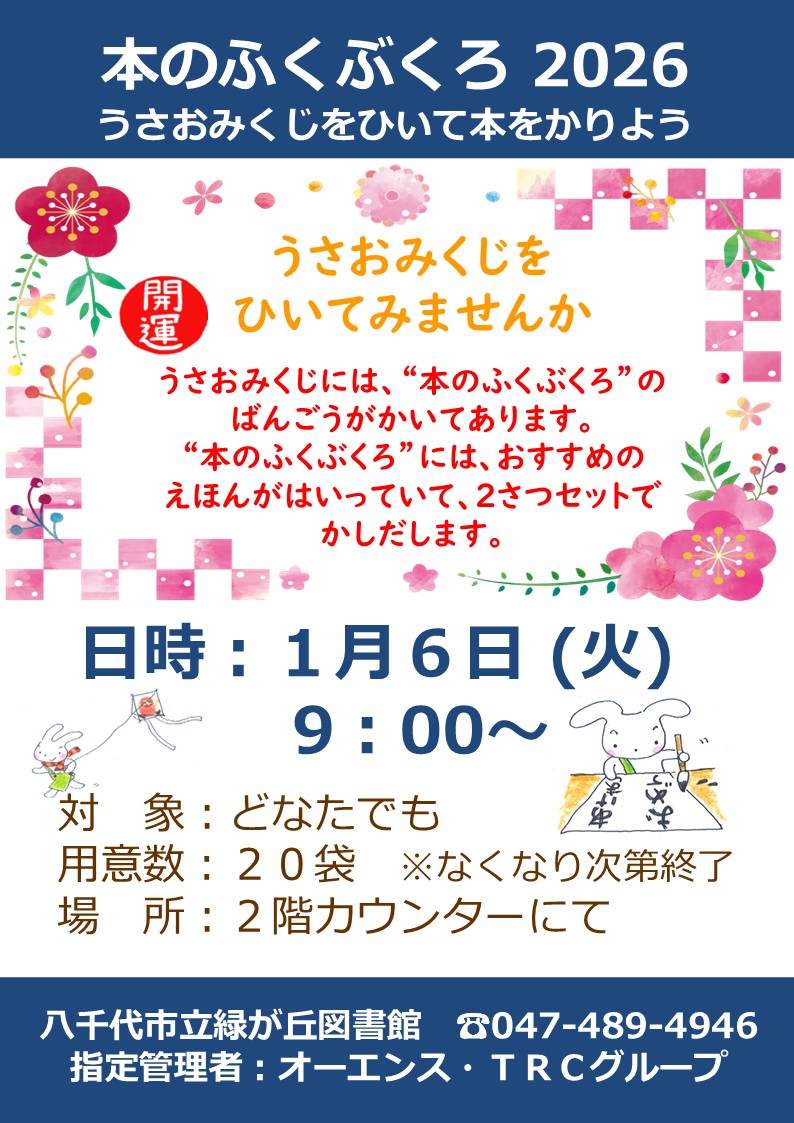2025/12/16 『本のふくぶくろ 2026 うさおみくじをひいて本をかりよう』 うさおみくじをひいてみませんか うさおみくじには、“本のふくぶくろ”のばんごうがかいてあります。 “本のふくぶくろ”には、おすすめのえほんがはいっていて、2さつセットでかしだします。 にちじ:1月6日 (火) 9:00~ よういすう:20ふくろ ※なくなりしだいしゅうりょう ばしょ:2かいじどうしつカウンターにて
