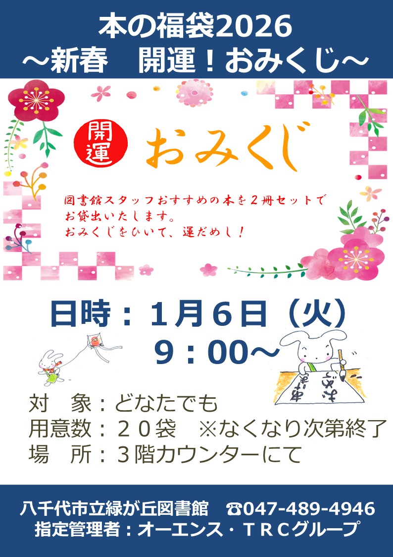 2025/12/16 『本の福袋2026』 新年1月6日(火)九時から『本の福袋2025』が始まります。 大人向け:3階、子ども向け:2階で配布。 各先着20本。なくなり次第終了。 くじを引いて出た番号の福袋を貸出します。福袋には本が2冊入っており、 「普段手に取らない本に出会えて良かった」と毎年好評です。 ※利用券が必要です。※貸出枠に2冊分の空きが必要です。 ※15冊貸出中の方は返却資料(2冊以上)をお持ちください。