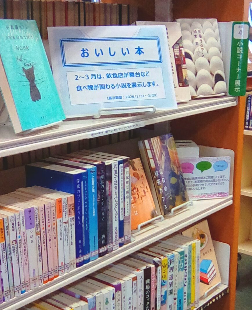 2026/02/07 【2月~3月 3階小説コーナー展示『おいしい本』】 2~3月の小説のミニ展示(4の棚)は、 『おいしい本』です。 飲食店が舞台など食べ物が関わる本を集めて展示します。 展示期間は、1/31~3/29までです。
