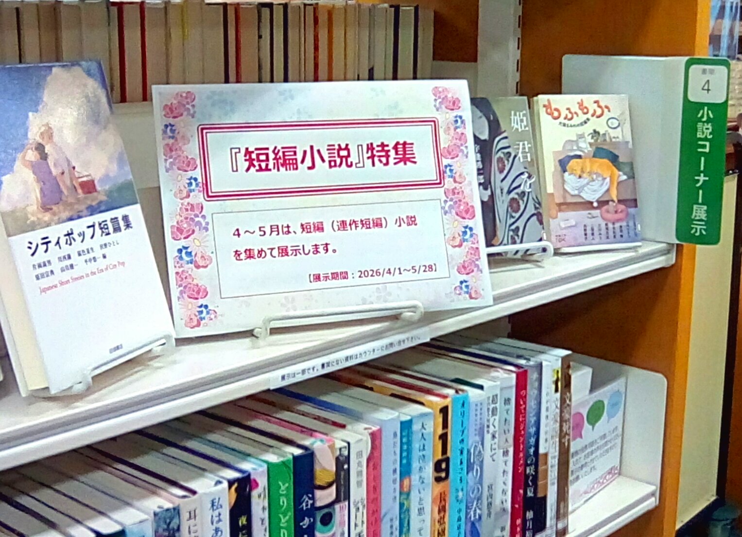 2026/04/01 【4月~5月 3階小説コーナー展示『短編小説』】 4~5月の小説のミニ展示は、『短編小説』特集です。 一人の作家さんの短編集や複数の作家さんによる短編集を集めて展示します。 展示期間は、4/1(水)~5/28(木)までです。