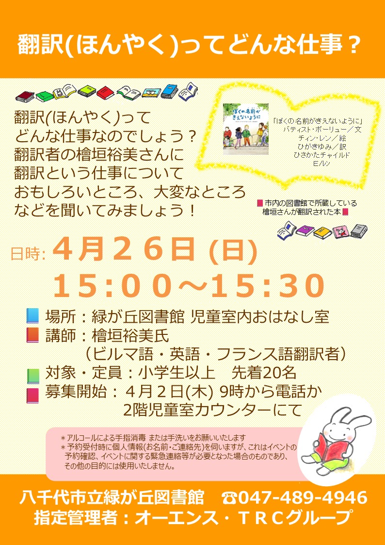 2026/04/01 イベント「ほんやくってどんなしごと?」があります!! 「翻訳(ほんやく)」って どんなしごとなのでしょう? “翻訳者(ほんやくしゃ)”のひがきゆみさんに、「ほんやく」という しごとについて、おもしろいところ、たいへんなところなどを きいてみましょう! ひがきさんにきいてみたいことをおしえてください。 じどうしつのカウンターで、スタッフにつたえてくださいね。 にちじ:4/26 にちようび 15じ~15じ30ぷん ばしょ:みどりがおかとしょかん じどうしつない おはなししつ たいしょう・ていいん:しょうがくせいいじょう せんちゃく20めい *4/2もくようび 9じからでんわか、2かいじどうしつカウンターにて うけつけします