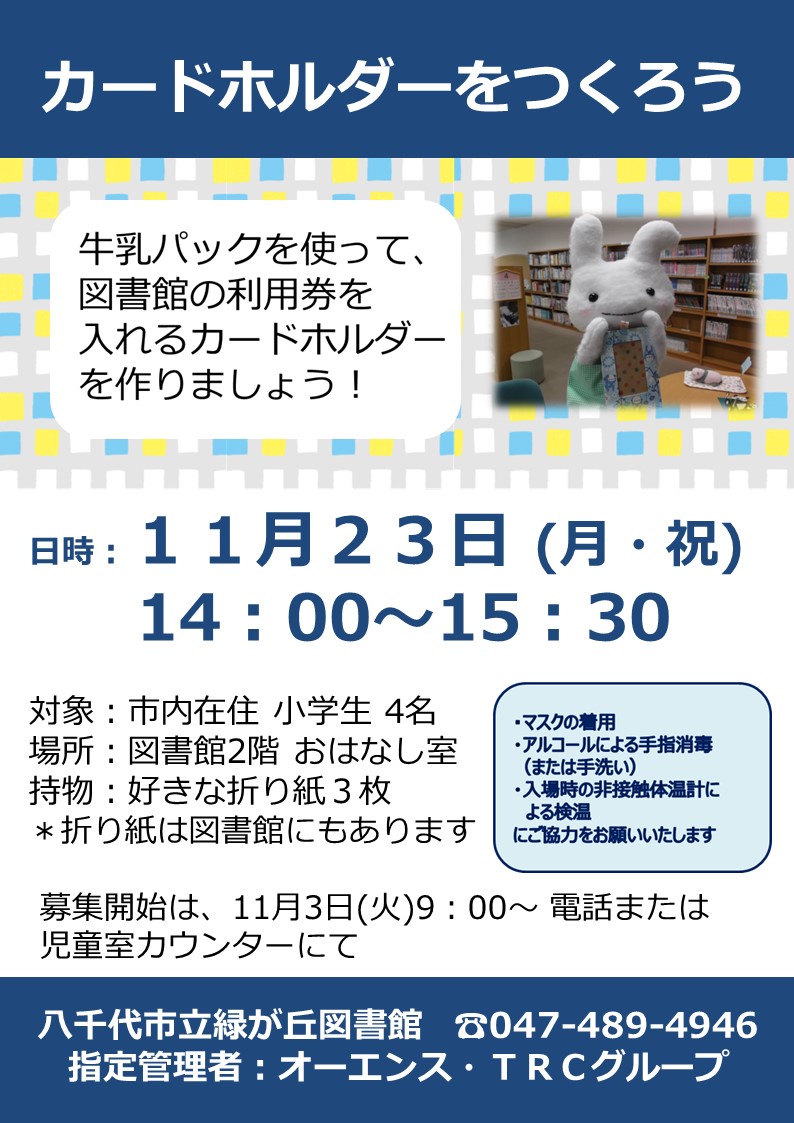 2020/11/05 “カードホルダーをつくろう”をおこないます 図書館の利用券を入れるカードホルダーを、 自分の好きな折り紙を使って作りましょう! イベントは11/23(月・祝)14時から15時30分に おこないます。 11/5現在、申込受付中です。お申込みお待ちしています。