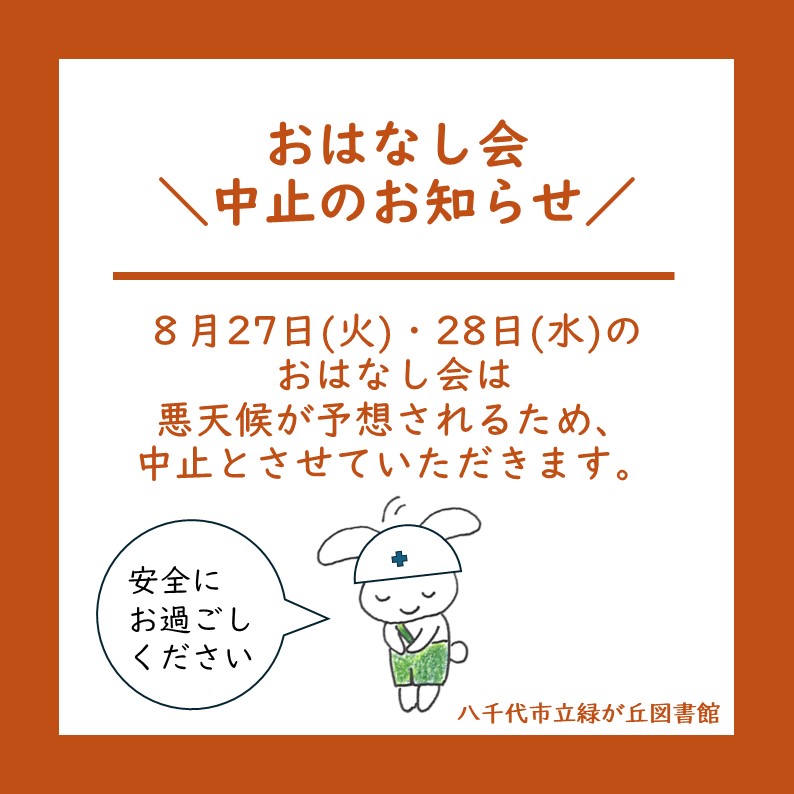 2024/08/25 8/27(火)・8/28(水) おはなし会中止のおしらせ 8/27(火) 高津ともしび えほんのじかん(11:00~11:15)・8/28(水) 本だいすき!の会おはなし会(16:00~16:20)は、悪天候が予想されるため、中止とさせていただきます。 どうぞよろしくお願いいたします。
